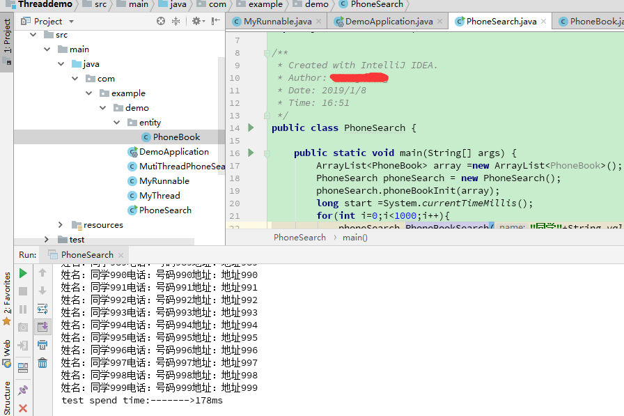public class DemoApplication { public static void main(String[] args) { SpringApplication.run(DemoApplication.class, args); /*for MutiThreadPhoneSearch.java 多线程实现*/ ArrayList<PhoneBook> array =new ArrayList<PhoneBook>(); PhoneSearch phoneSearch = new PhoneSearch(); phoneSearch.phoneBookInit(array); long start =System.currentTimeMillis(); for(int i=0;i<1000;i++){ MutiThreadPhoneSearch mutiThreadPhoneSearch = new MutiThreadPhoneSearch("同学"+String.valueOf(i),array); Thread thread = new Thread(mutiThreadPhoneSearch); thread.start(); } long end = System.currentTimeMillis(); long total = end-start; System.out.println("test spend time:------->"+total+"ms"); } public void phoneBookInit(ArrayList<PhoneBook> inArray){ for(int i=0;i<1000;i++){ PhoneBook temp =new PhoneBook(); temp.setName("同学"+String.valueOf(i)); temp.setPhone("号码"+String.valueOf(i)); temp.setAddress("地址"+String.valueOf(i)); inArray.add(temp); } } }