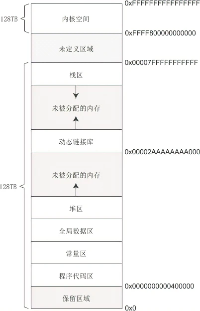 Linux下64位环境的用户空间内存分布: