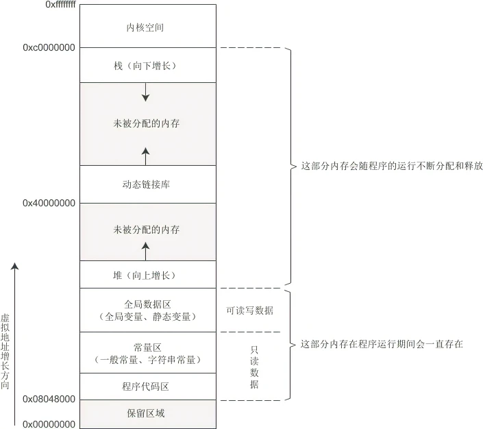 Linux下32位环境的用户空间内存分布:
