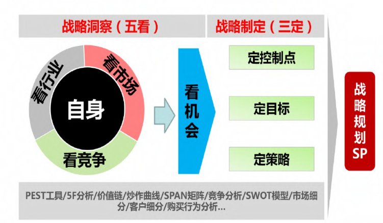五看,是市场洞察的常用工具,“五看”主要包括看行业、看市场、看客户、看竞争、看自己,也是一套非常系统的战略洞察的方法。