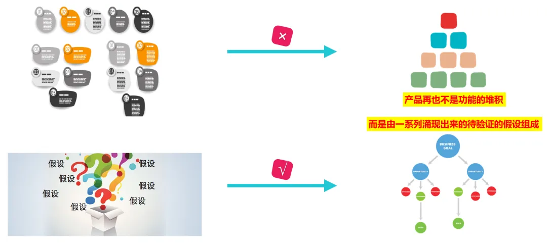 企业孵化新业务时必然会面对很多未知的挑战,其中最大的挫败往往是历尽艰辛做出自认为完美的产品后却发现其并不被市场认可。此时,企业会幡然醒悟:如果最初就走错了方向,那么排除万难完成了看似完美的计划又有何意义?因此,产品再也不是功能的推积,而是一系列需求假设的验证: