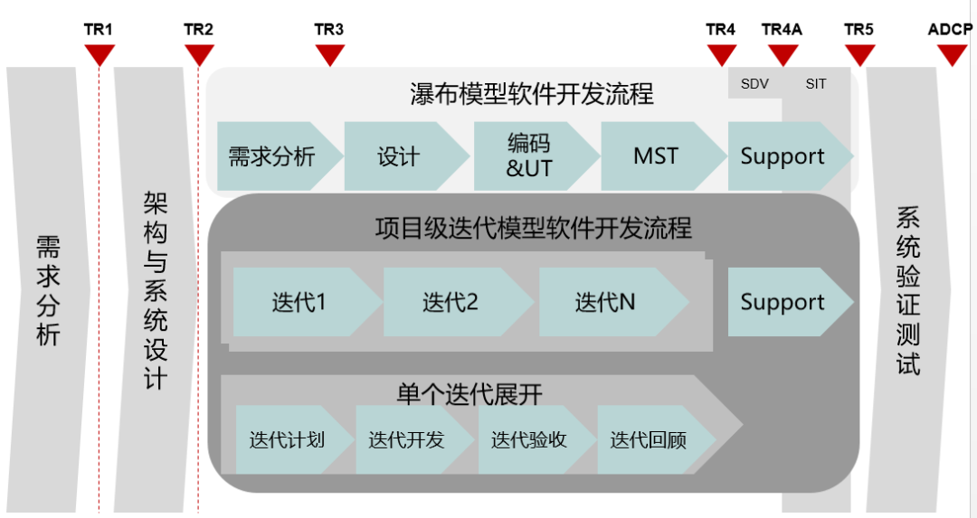 - 软硬件结合项目:TR2后可以开始迭代,PDCP前进行1-2轮迭代,控制投入量。硬件开发的风险相对软件较小,则可以采用敏捷迭代的开发模式。