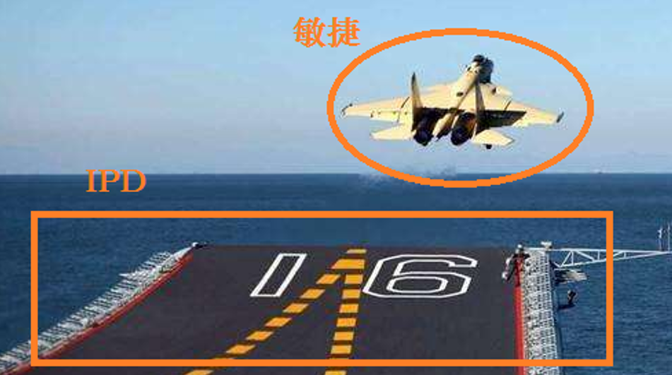 1)敏捷开发更加关注在软件研发领域,IPD的思想则是产品运营领域,视角不同,着重点就不同,如果把敏捷比喻成导弹,那么IPD就是原子弹,如果把敏捷比喻为战投机,那么IPD就是航空母舰。