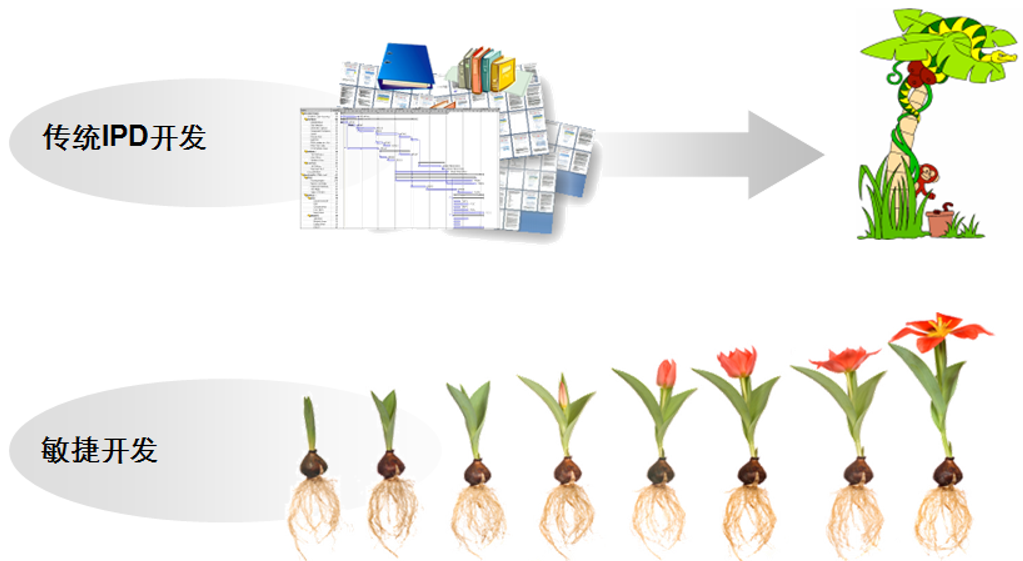 2)从整体上看,IPD更加注重流程,在概念、计划、开发、验证、发布、维护阶段设置阶段性决策点,通过决策点对产品做出调整、保证投资收益比。敏捷更加注重沟通,强调拥抱变化,强调与客户的紧密合作。当以市场为目标时,IPD更加实用。当以项目为目标时,敏捷更加实用。如下图: