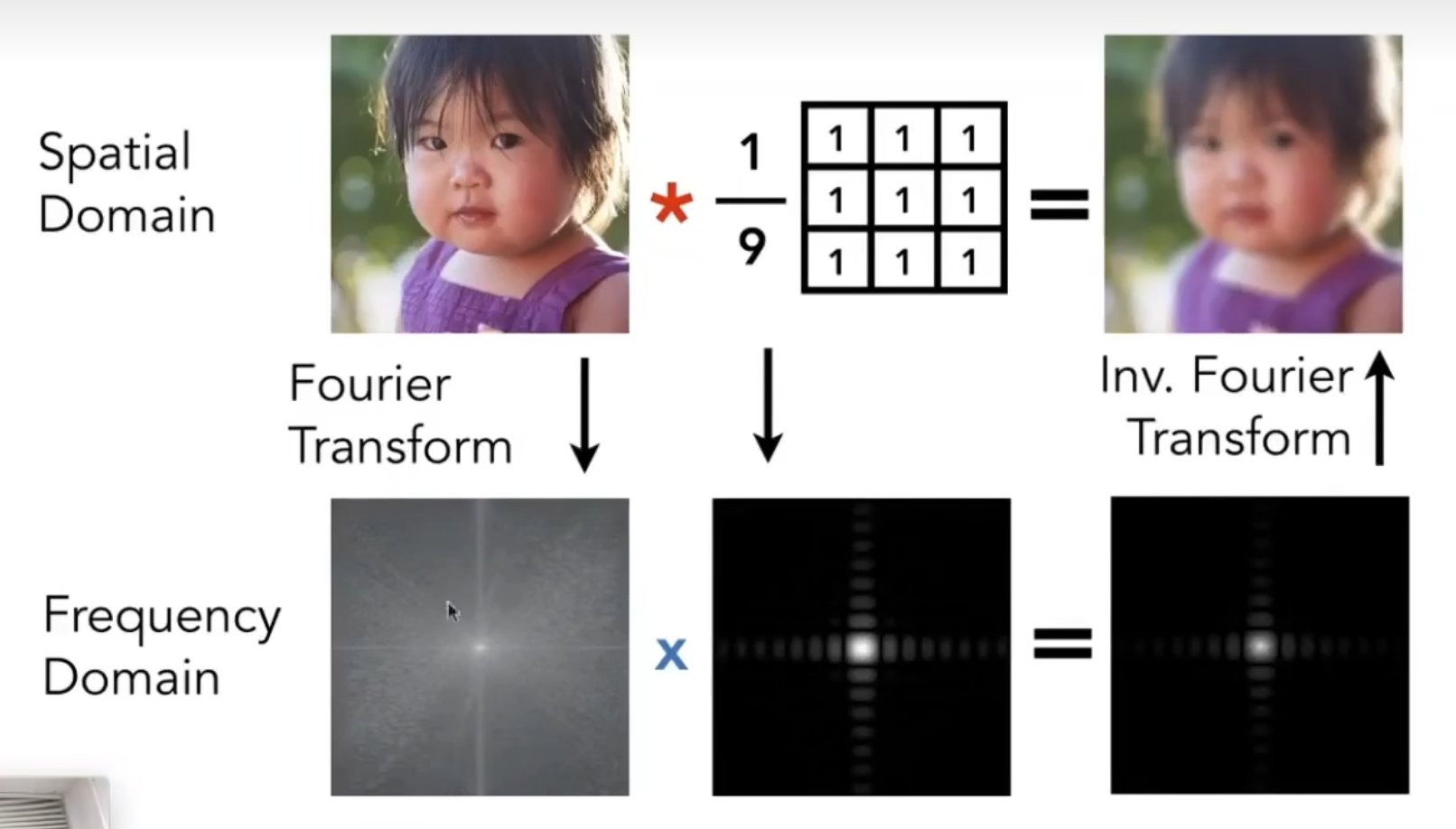 我们也可以将图像先进行傅里叶变换后得到频域,滤波器也变成频域,两个相乘后得到的结果再逆傅里叶变换得到图像,效果一致。