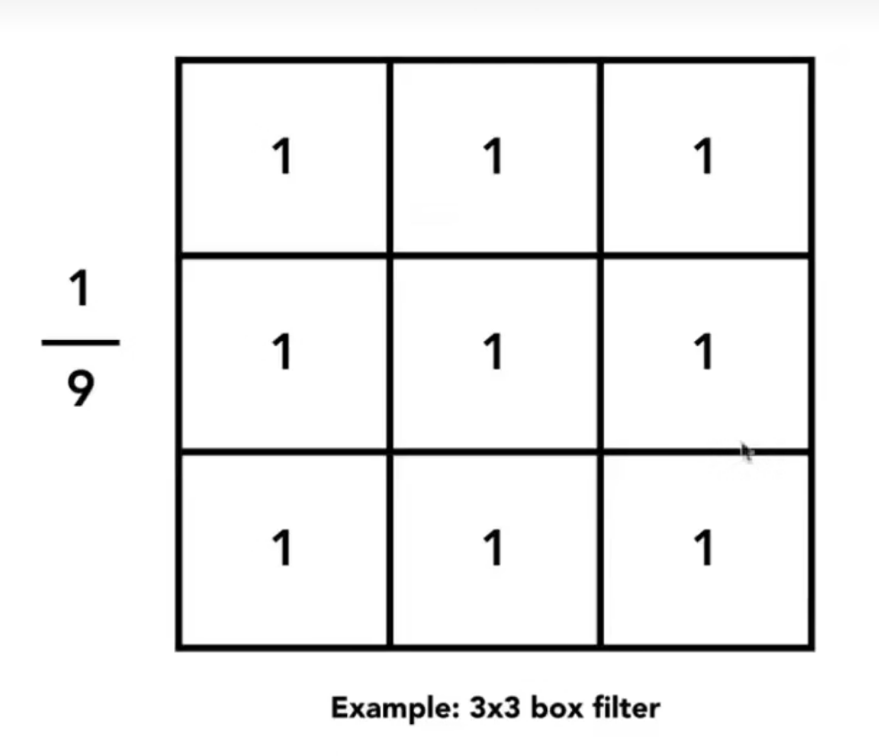 在该图像上方,展示的是对于一个图形的每个像素(以及与其相邻的像素)都与中间的滤波器进行卷积运算,最终得到的每个像素都受到周围的影响趋于平均,因此边界感减弱,图像变得模糊