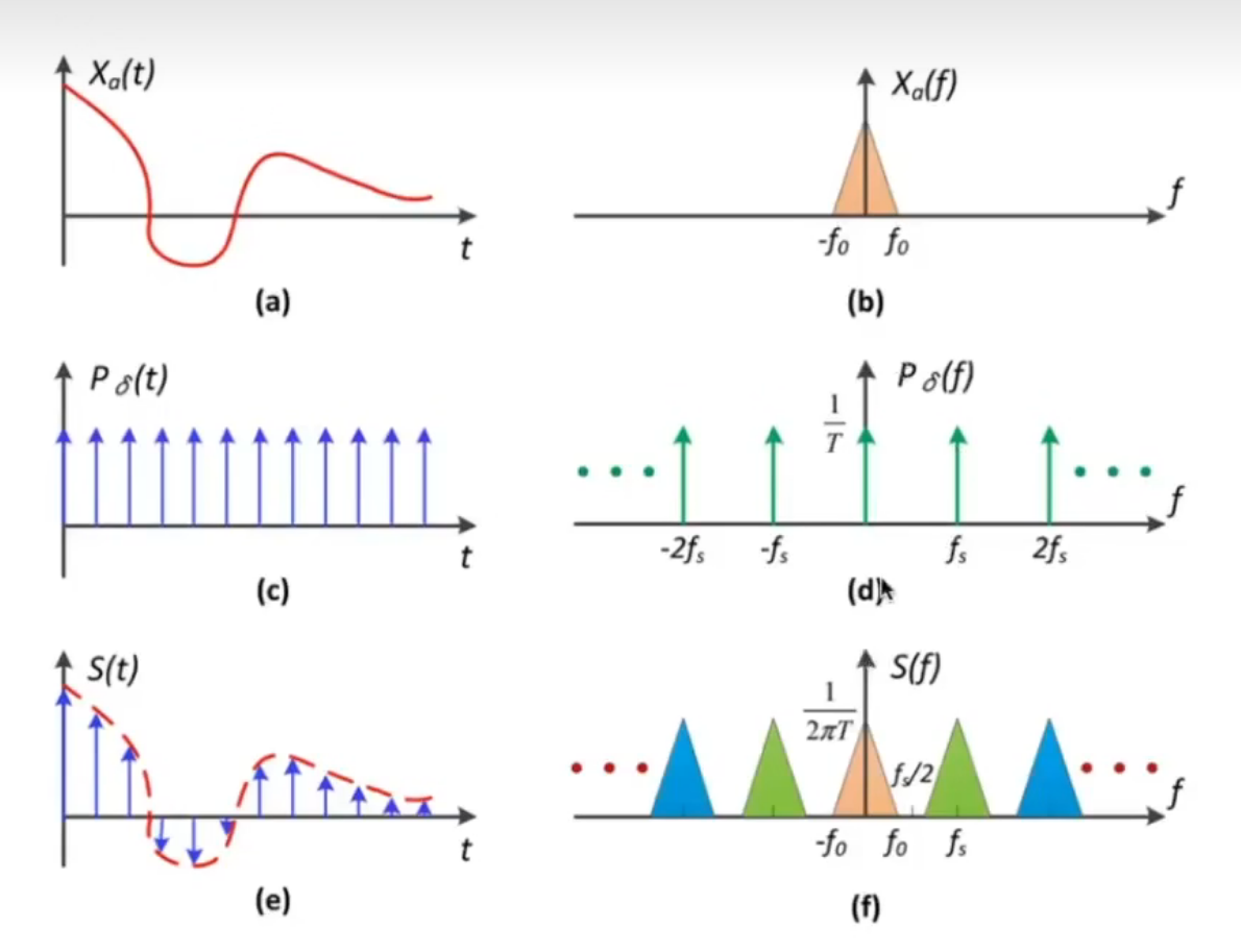 然后又谈到走样的问题,上图的b中频率有一定范围,f也是如此,如果采样频率较低,两次采样中间差的时间多,也就是在时域上间隔宽,那在频域上间隔就会窄