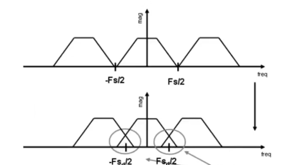 当频率低到一定程度,在频域上就会出现两次采样在频域上重叠的情况,如下图