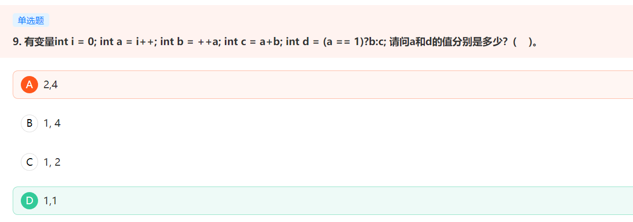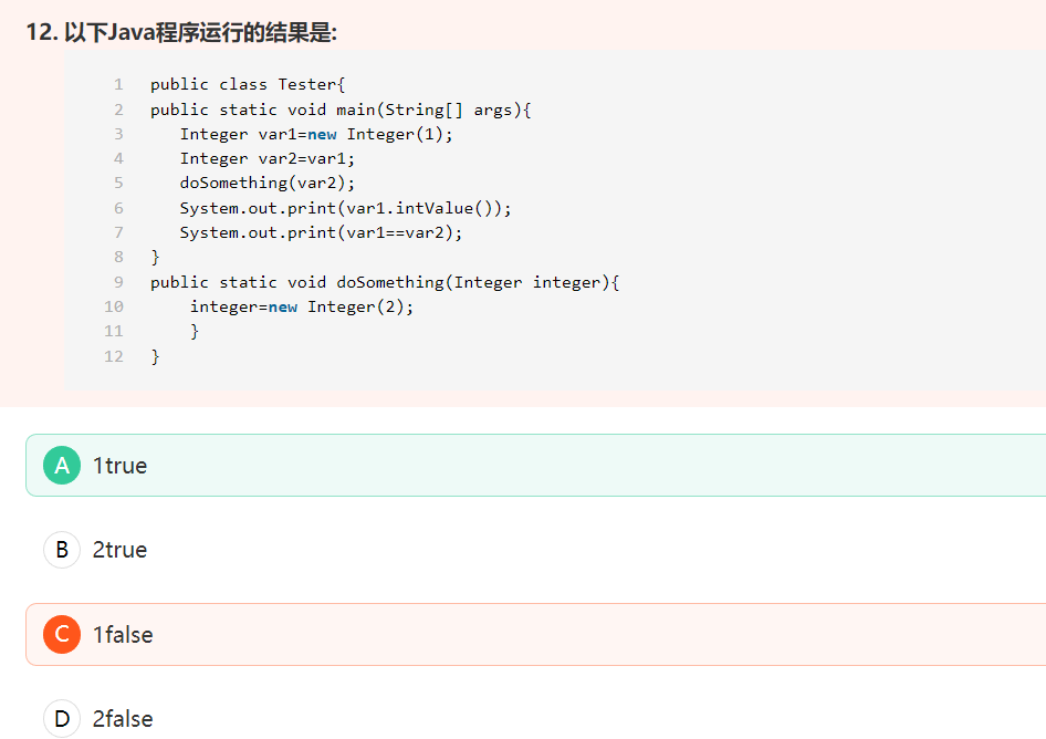 - 选项D,普通new创建对象,两个new创建两个地址不同的对像,所以c1==c2返回false。