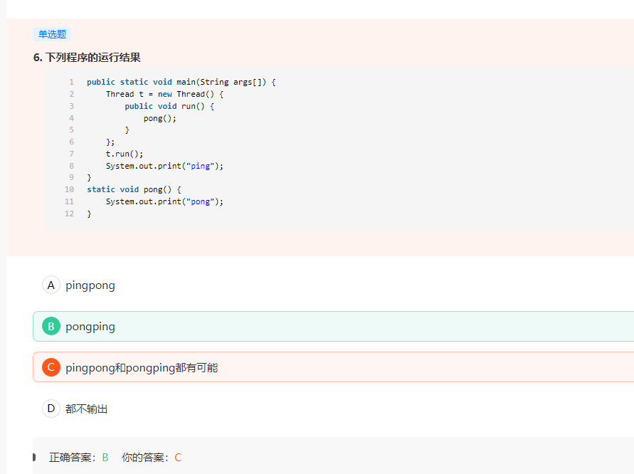 在第7行的时候,调用的是t.run();方法,之间调用run方法就是普通的方法调用而已,所以肯定是先执行pong()再执行System.out.print("ping");