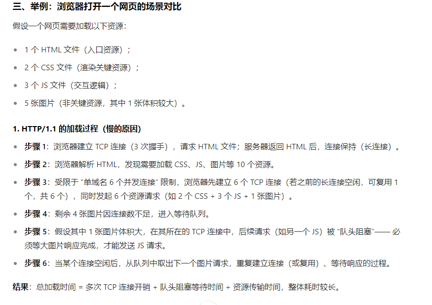 对于HTTP/1.1来说,不管是否使用管道化技术,都会有“队头阻塞”问题:在一个连接中某个请求处理时间过长就会导致阻塞后面请求的处理。针对队头阻塞问题可以进行相应的改进措施:如浏览器会采用多TCP连接(浏览器对于同一域名下的连接数有限制,一般是 4-8 个)来分散请求;将资源分散到多个子域名以绕过浏览器对单域名的连接数限制(增加了DNS解析开销);合并 CSS/JS 文件和启用 Gzip 压缩以减少请求数量和数据量。