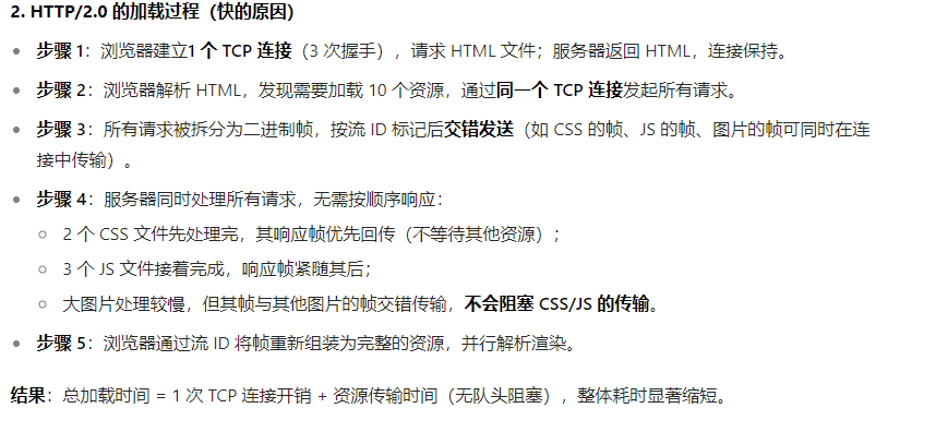 - HTTP2.0 支持HTTPS但也支持明文 HTTP 传输,SPDY 则强制使用 HTTPS