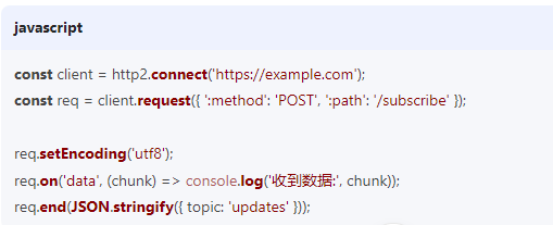 使用http/2和websocket都可以实现服务端推送,但在浏览器中不能直接使用http/2,浏览器对于http/2中服务端推送自动处理(浏览器自动使用服务端推送过来的css、js等资源),JS中没有提供http/2相关技术,无法像fetch()或XMLHttpRequest那样发起请求后可在回调中处理服务端的回应。而JS中就提供了WebSocket对象来实现websocket通信。如果客户端要实现http/2的话,可以使用node,如下为实现单向通信(类似SSE)的代码,也可以实现像websocket那样的双向通信,http/2服务端也可以使用node来实现。其实一般我们不会直接在客户端/服务端中使用http/2来实现通信,而是使用集成了http/2的库,比如可以使用grpc来实现客户端/服务端通信。