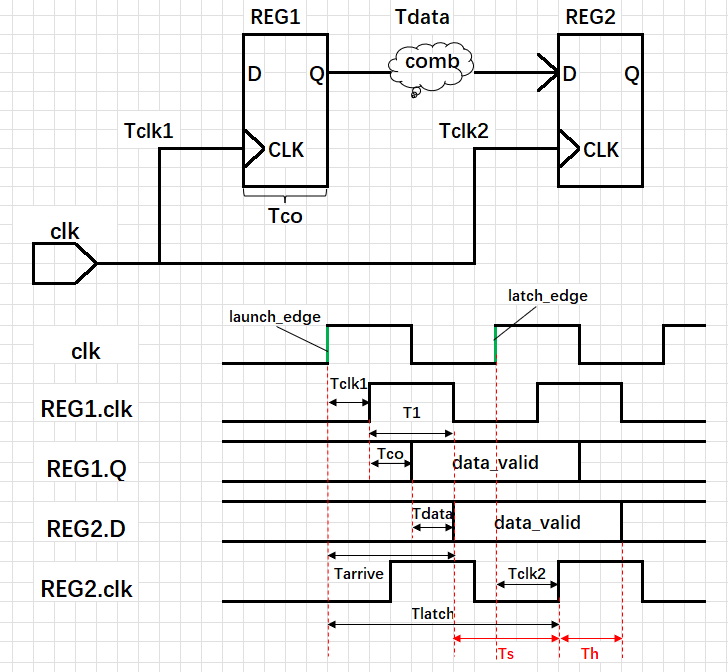 - Tclk1:时钟源clk扇出信号到寄存器1(REG1)的时钟端所需要的时间