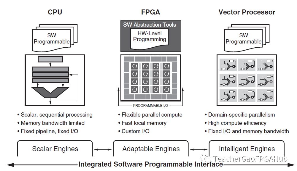 - Xilinx Versel系列产品是业界第一款自适应加速计算平台(ASAP:Adaptive Compute Acceleration Platform),同时也是一款异构计算平台,它将三种引擎集成于其中:标量引擎(Scalar Engine,ARM核)、自适应引擎(AdaptableEngine,传统FPGA资源+NOC)和智能引擎(IntelligentEngine,包括AI Engine和DSP Engine)。