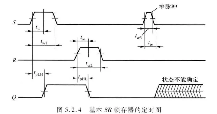 - 脉冲宽度tw:锁存器要正常工作必须保证S和R的高电平脉冲宽度不小于某一最小值tw,当其满足要求时电路能可靠地实现翻转。但如果加在S或R端的脉冲宽度过窄,在Q端电压尚未越过逻辑阈值电平时,S端的高电平就被撤除,电路可能又回到原来的状态,或者使Q的最终状态不能确定。