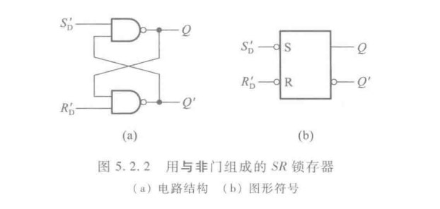 - 与非门构成的基本S`R`锁存器:将或非门替换为与非门,此时输入信号S`和R`以逻辑0为有效作用信号