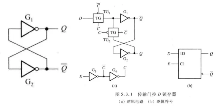 - D锁存器:与SR锁存器不同的时,D锁存器在工作中不存在非定义状态,因而使用更加广泛。目前CMOS集成电路主要采用传输门控D锁存器和逻辑门控D锁存器两种电路结构。