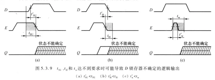b.建立时间tSU:信号D的逻辑电平必须在使能信号E下降沿到来之前建立起来,才能保证正确地锁存,它表示D信号对E下降沿的最少时间提前量。