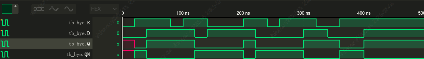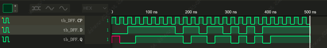 注意到写Q <= D 和 Q = D 波形都是一样的,因为是电平触发,只要敏感条件列表为真,就会把右边的值赋给左边