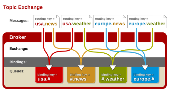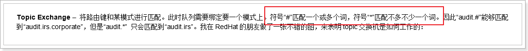 <!-- 定义交换机绑定队列(通配符模式) #匹配一个或多个词 *匹配一个词 --> <rabbit:topic-exchange name="IExchange" id="IExchange"> <rabbit:bindings> <rabbit:binding queue="que_cat" pattern="cat.#"/> <rabbit:binding queue="que_pig" pattern="pig.#" /> </rabbit:bindings> </rabbit:topic-exchange>