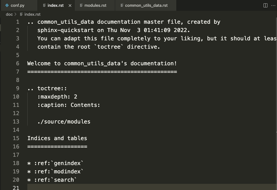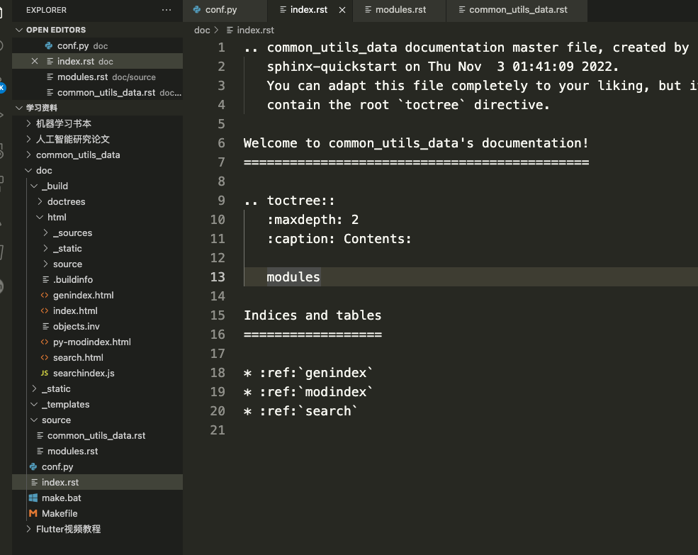 在外面的index.rst文件加上modules,注意modules.rst的位置如果modules.rst在source文件夹里面,需要填 source/modules.rst