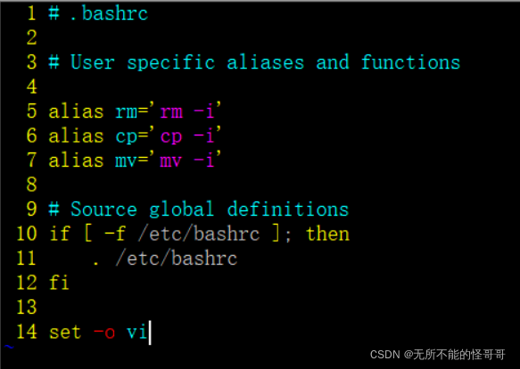 使用第一种方法,每次重新开机命令就失效了,要想永久有效,可以修改配置文件.bashrc,其实我们每次开机进入shell之前,系统都会运行.bashrc这个文件,我们只要把上面的命令加到这个配置文件中,就相当于每次开机都执行了一次 set -o vi,这样就可以永久有效了。