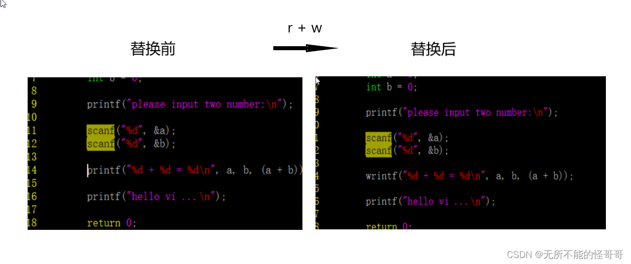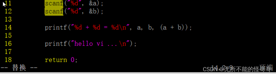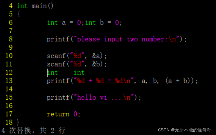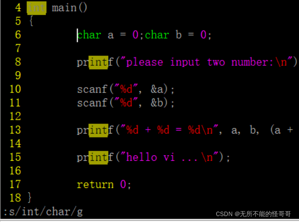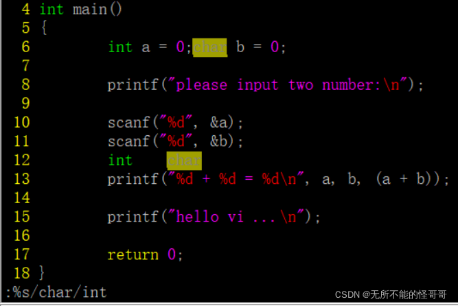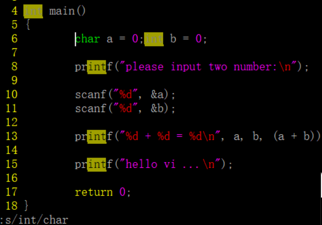冒号:进入末行模式,并输入命令 s/int/char,回车执行,可以看到第一个替换成char了,第二个没有替换。