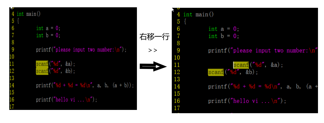 | n>> | 当前光标所在的行开始往下数n行,全部右移一个Tab |