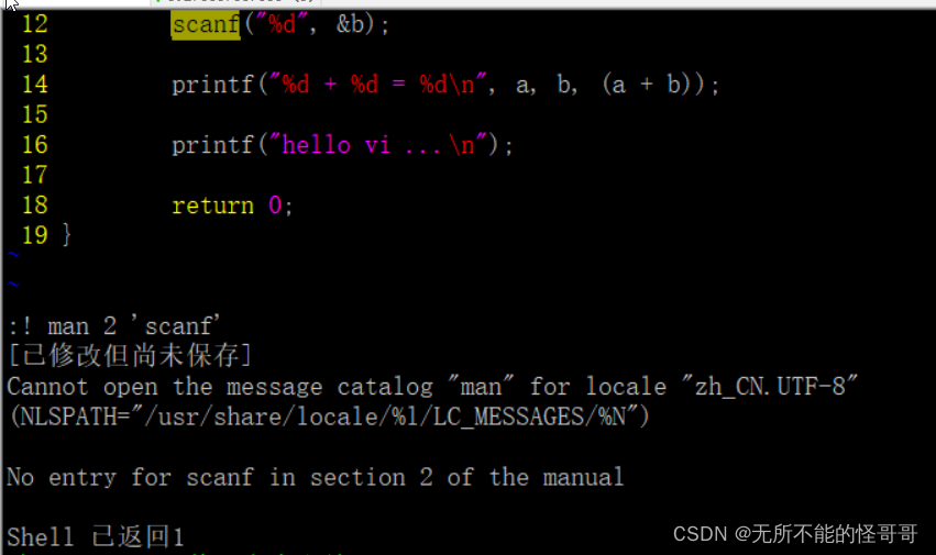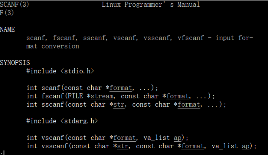 使用2 shift+k命令对scanf函数进入man帮助手册第二章,对库函数进入man手册第二章是进不去的,因为man的第二章是系统调用相关的,对某个函数进入man手册相应章节时应该对号入座,否则就直接shift+k不选章节。