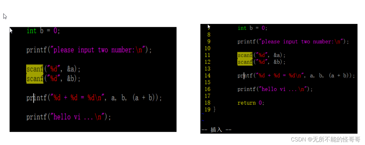 插入模式就是编辑模式,没什么好讲的,就是开始对文件进行编辑,通过上下左右键可以移动光标,底部会有插入两个字提示当前在插入模式。但是,默认情况下编辑文件还是非常不方便的,比如不像集成开发环境那样可以自动补全括号,函数提示等,但是我们可以对vim进行配置,这些在后面一章讲解。