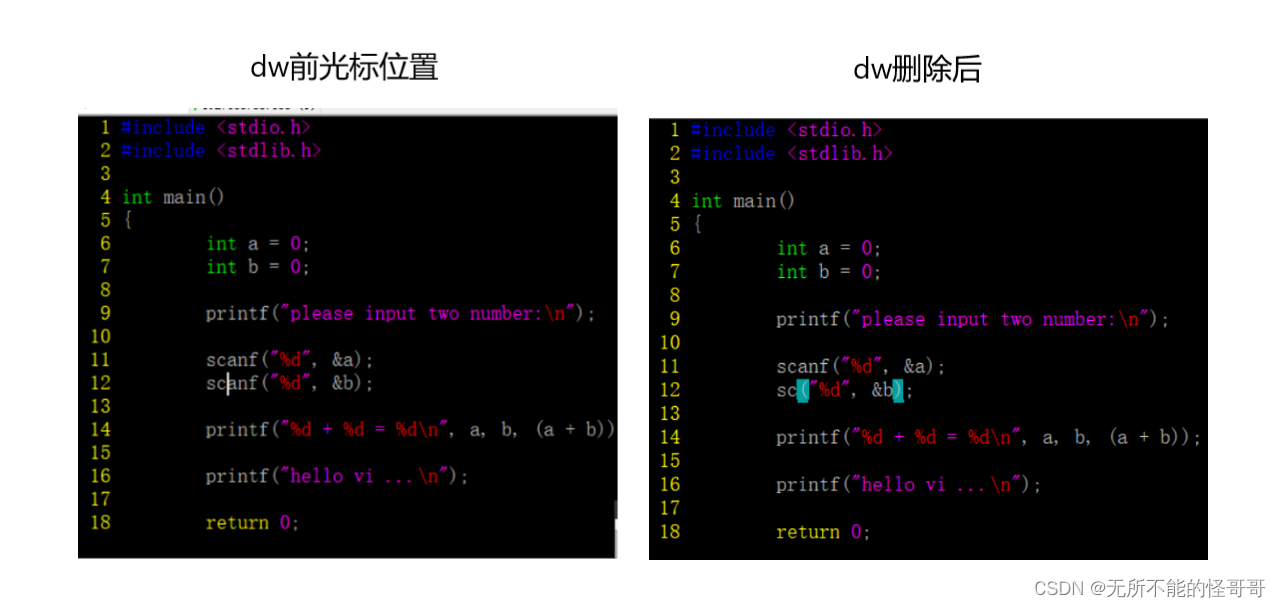 | dw | 删除光标所在位置到光标所在单词的尾部 |