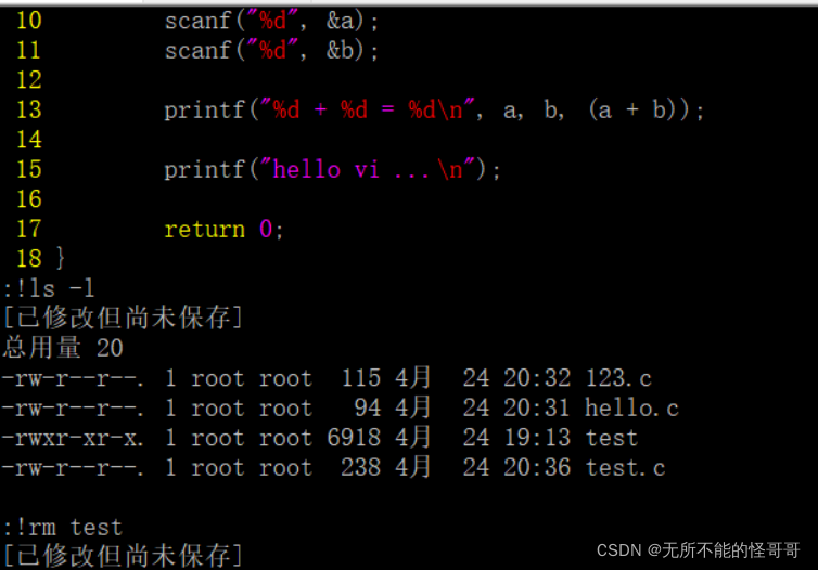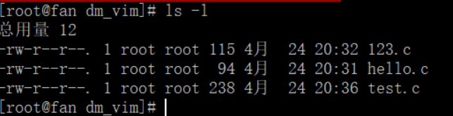 输入!ls -l,相当于执行shell下的命令ls -l,同样可以删除文件,当我们在vim编辑器的末行模式下删除文件test后,再转到shell下查看,可以看到test文件已被删除。