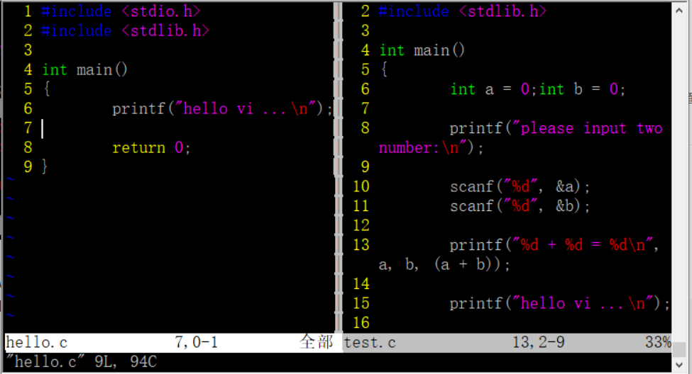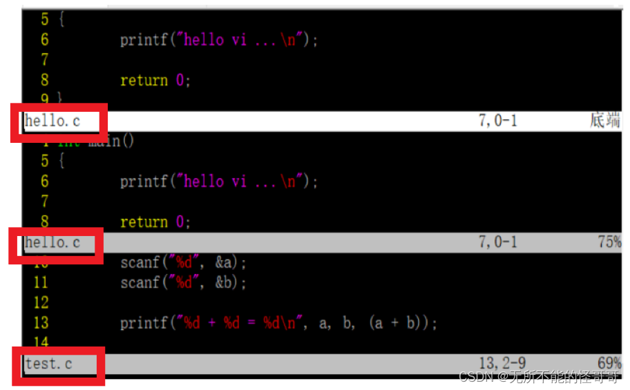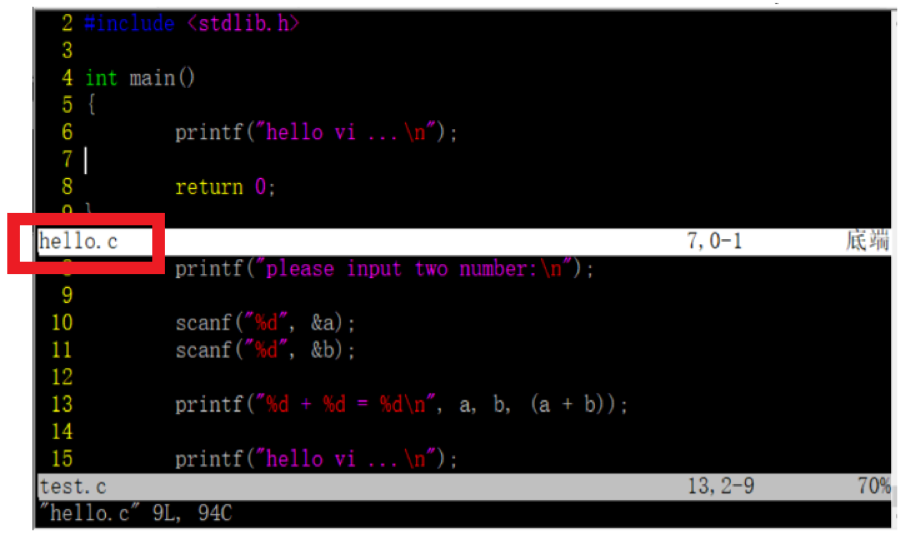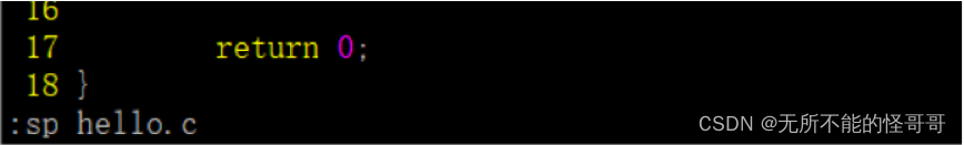 再次按:进入末行模式,输入sp不加任何文件名,它会默认打开当前光标所在的文件,也就是hello.c,光标所在的文件也就是被选中的文件,其文件名会有高亮的背光可以区分。