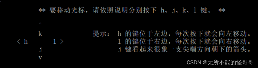 最基本的上下左右移动,可以在教程中看到,四个方向键和k/h/j/l四个字母键。