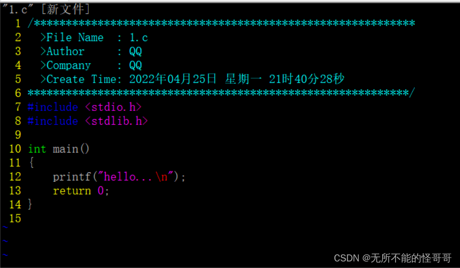 新创建的C文件直接包含了文件信息(文件名、作者、单位、时间),并且写好了main函数框架和头文件,如果你经常使用Visual Studio开发的话,应该用过Visual Assist插件吧(红苹果插件,如果你没用过的话一定要试试,非常强大,在我的资源有上传哦),这个功能有点像Visual Assist插件,非常方便,并且看起来很高级,其实这也是通过.vimrc配置出来的,具体内容如下