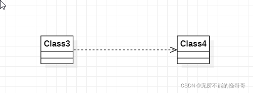 Dependency,依赖关系是指在一个类中要用到另一个类的实例的一种关系,主要表现为一个类是另一个类的函数参数,或者一个类是另一个类的函数返回值的情况。在类图中的表现形式为一个虚线箭头从一个类指向被依赖的类。