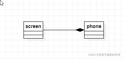 聚合关系的简单理解,屏幕screen是手机phone的一部分,并且屏幕screen离开手机phone之后就失去了存在的意义,这就是组合关系。代码表现形式为: