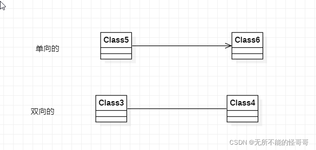 Association,关联关系是类和类之间对应的一种连结,是指两个独立的对象,一个对象的实例与另一个对象的一些特定实例存在固定的对应关系。关联关系可以是单向的也可以是双向的,通过关联使得一个类可以使用另一个类的属性和方法,在C++中具体的表现形式为,一个类的对象是另一个类的成员属性。在类图中,单向的是带箭头的实线,双向的是不带箭头的实线。