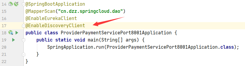 主程序启动类,需要一个@EnableDiscoveryClient注解: