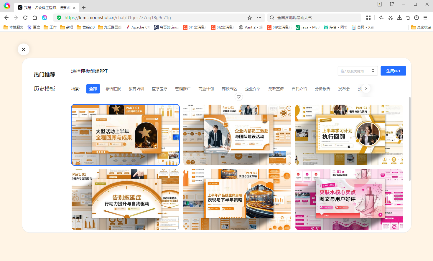 在输出之后,你可以对KIMI生成的大纲进行调整,点击【一键生成PPT】按钮之后,Kimi会提供一系列PPT模版供用户选择