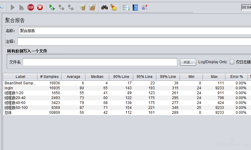 假设现在一共会加载 100 个线程,我期望聚合报告中分别展示 1-20,20-40,40-60,60-80 的四个阶段的线程并发性能数据,而不是一共总体的统计数据