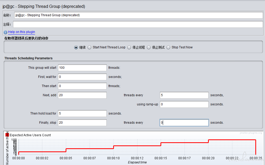 下图表示每隔 5s 启动 20 个线程,一共启动 100 个。