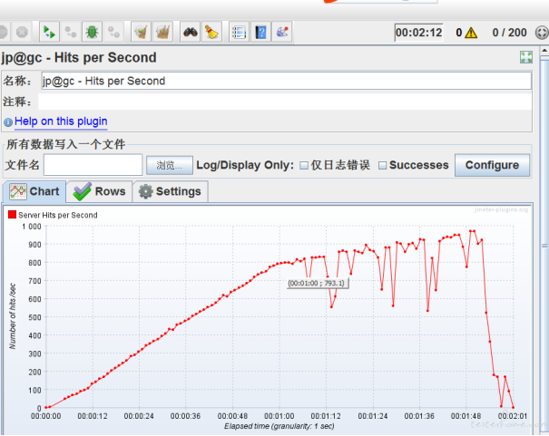 并发 200,不限迭代次数,同时在请求下面加 RPS 定时器。目的是在 200 线程下,将 RPS 逐步增加到 1000/S,并持续运行一段时间