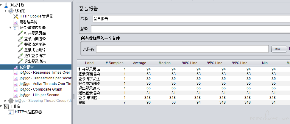 利用抓包工具, 编写"登录,退出"的脚本。 收集聚合报告的数据,加了事物控制器,归总了一下整体事物,响应时间如下图
