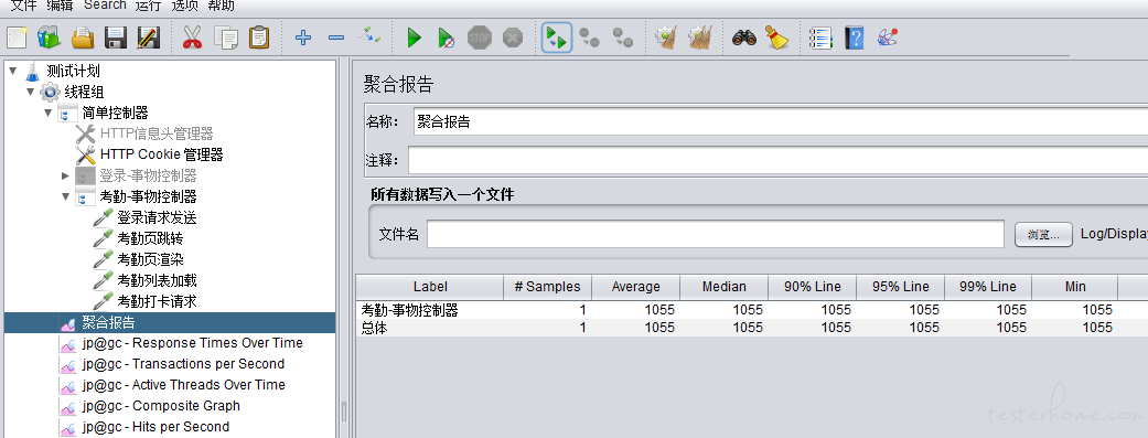 利用抓包工具, 编写"登录 - 考勤打卡"的脚本。 收集聚合报告的数据,加了事物控制器,归总了一下整体事物,响应时间如下图: