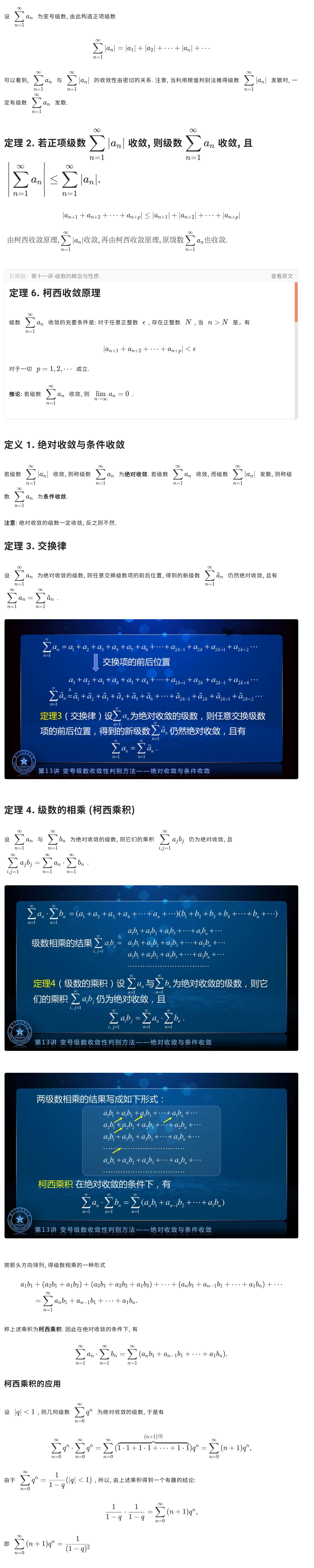 然后介绍了两个绝对收敛的级数的相乘的规律(柯西乘积),最后介绍一般级数的判定方法。