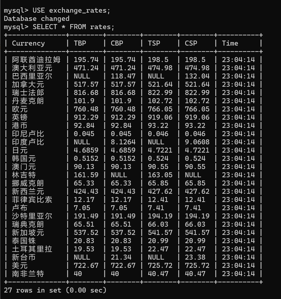 通过本次作业,实现了从中国银行外汇牌价页面爬取汇率数据,并将其存储到 MySQL 数据库中。这种方法可以进一步扩展,用于实时监控外汇汇率数据,为数据分析和金融研究提供支持。