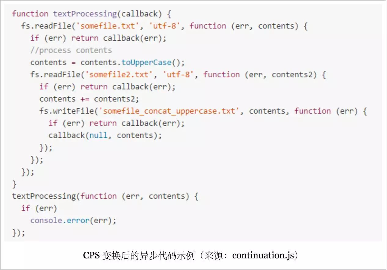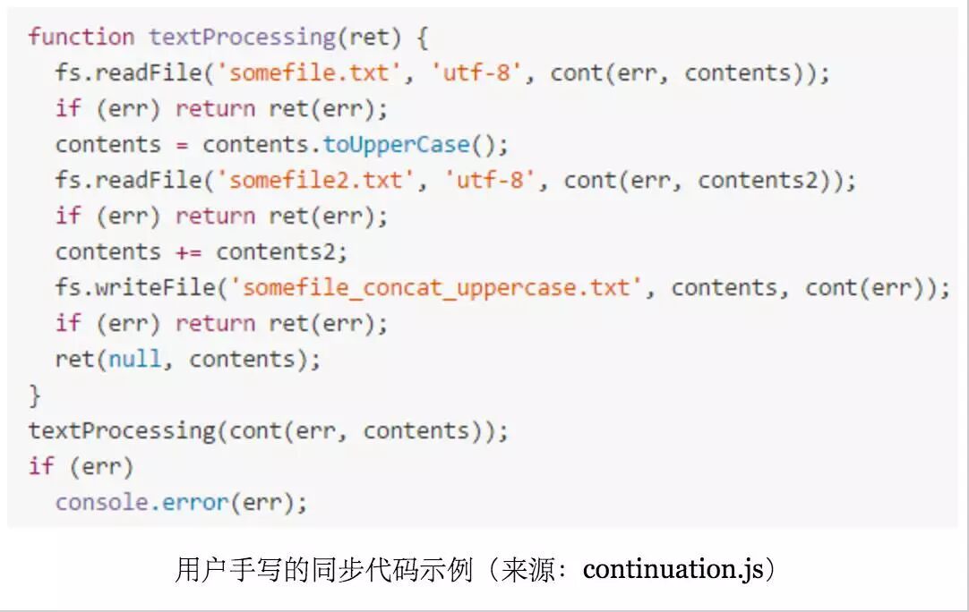 为了在异步环境里模拟 “顺序执行” 的效果,就需要把同步代码转换成异步形式,这称为 CPS(Continuation Passing Style)变换。BYVoid 大神的 continuation.js 库就是一个 CPS 变换的工具。用户只需用比较符合人类常理的同步方式书写代码,CPS 变换器会把它转换成层层嵌套的异步回调形式。