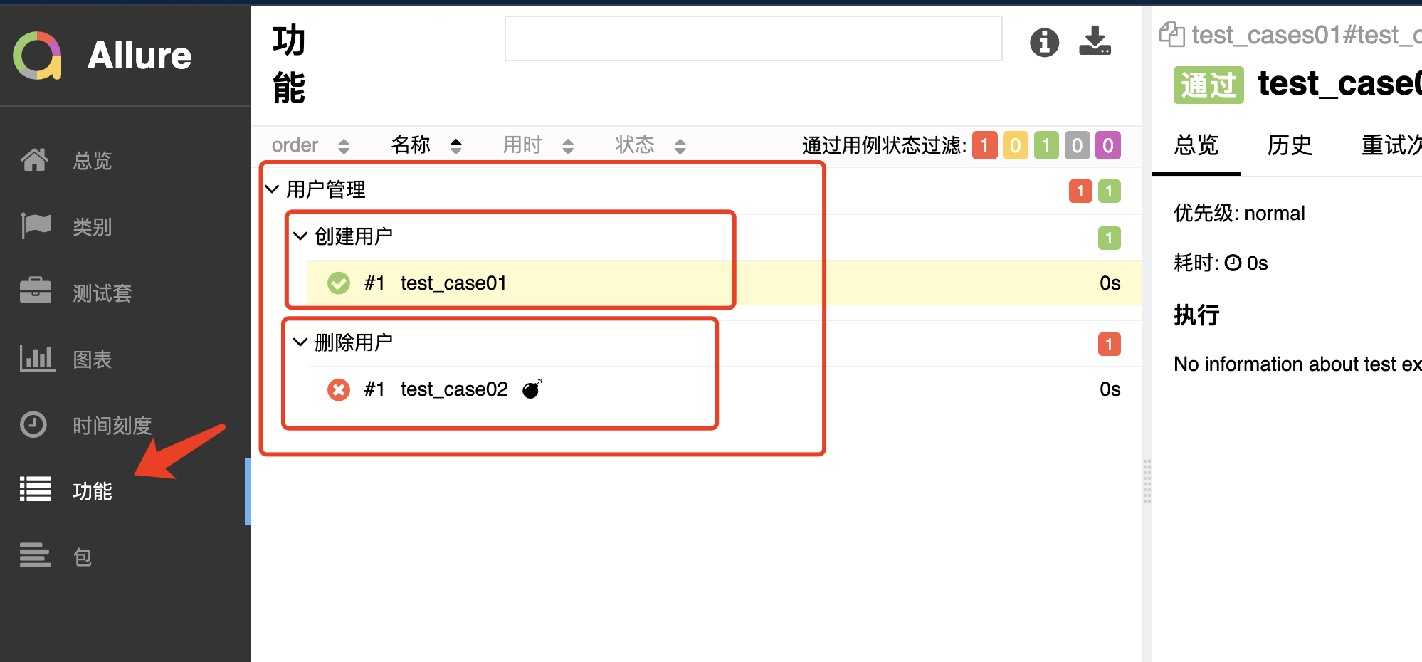 import allure import pytest @allure.feature("用户管理") @allure.story("创建用户") def test_case01(): assert True @allure.feature("用户管理") @allure.story("删除用户") def test_case02(): assert False